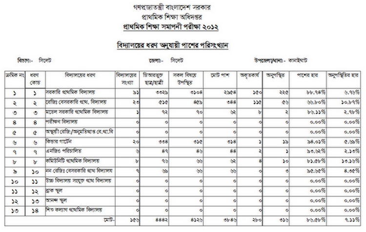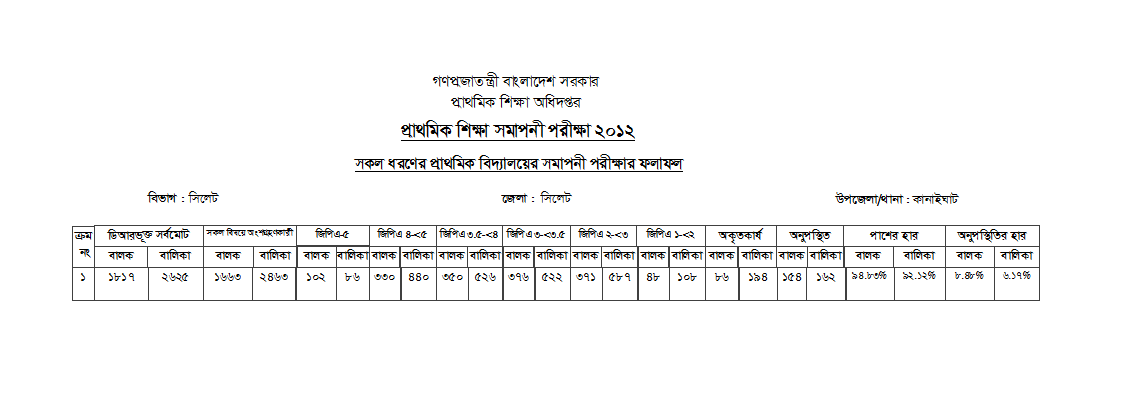 | ১ | প্রাথমিক শিক্ষা সমাপনী পরীক্ষা - ২০১২ এর পরীক্ষার ফলাফল প্রকাশ বিবরণী | | দেখুন |